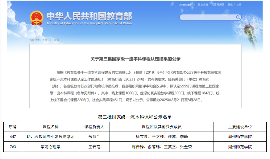 此次入选的课程为岳慧兰教师团队的《幼儿园教师专业发展与学习》和王云霞教师团队的《学前心理学》两门课程在教学内容、教学方法、教学团队等方面均具有显著优势。