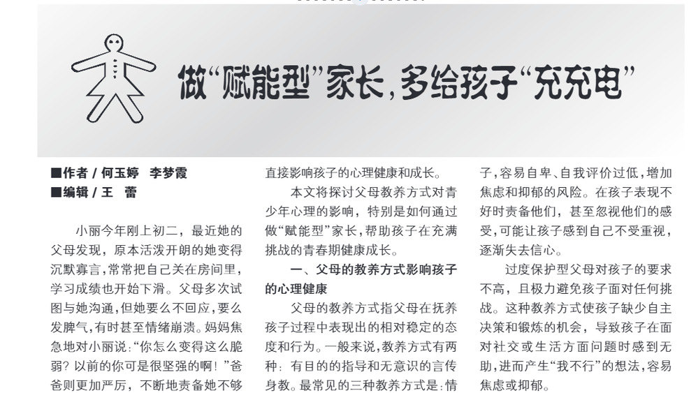 何玉婷,李梦霞.做“赋能型”家长,多给孩子“充充电”[J].大众心理学,2025,(01):30-31.DOI:CNKI:SUN:DZXI.0.2025-01-017.
