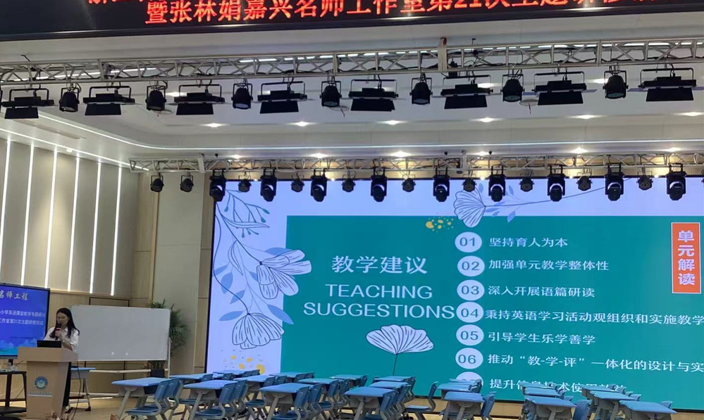 张林娟老师围绕展示课进行了专题点评,强调在单元整体视角下进行课时设计的重要性。她指出,教师应明确单元目标,坚持育人为本,秉持英语学习活动观深入开展语篇研读推动“教--评”一体化的设计与实施,促进学生英语核心素养的发展。