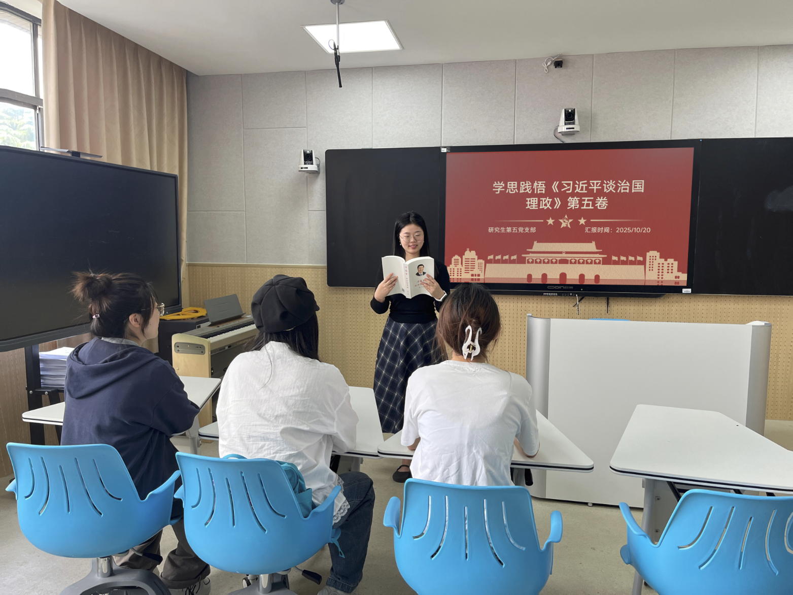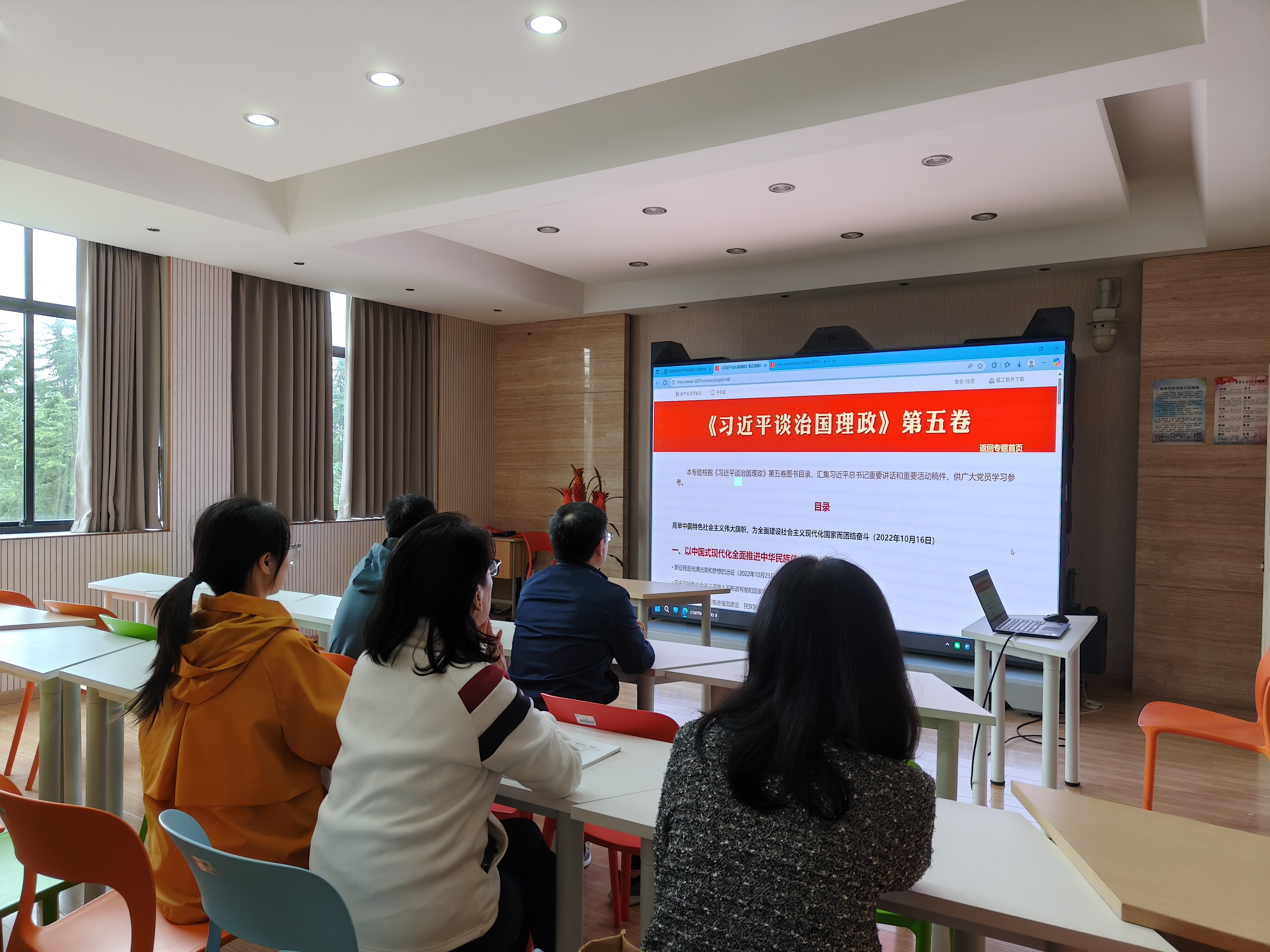 《习近平谈治国理政》第五卷集中记录了以习近平同志为核心的党中央团结带领全党全国各族人民在全面建设社会主义现代化国家新征程中的实践探索和理论创新,系统阐述了中国式现代化的鲜明特色、本质要求、重大原则和一系列战略部署,饱含习近平总书记治国理政的深邃思考和使命担当,具有重要的思想力量、真理力量和实践指导意义。在学习过程中,各师生党员结合自身学习与工作实际深入交流研讨,畅谈心得体会。