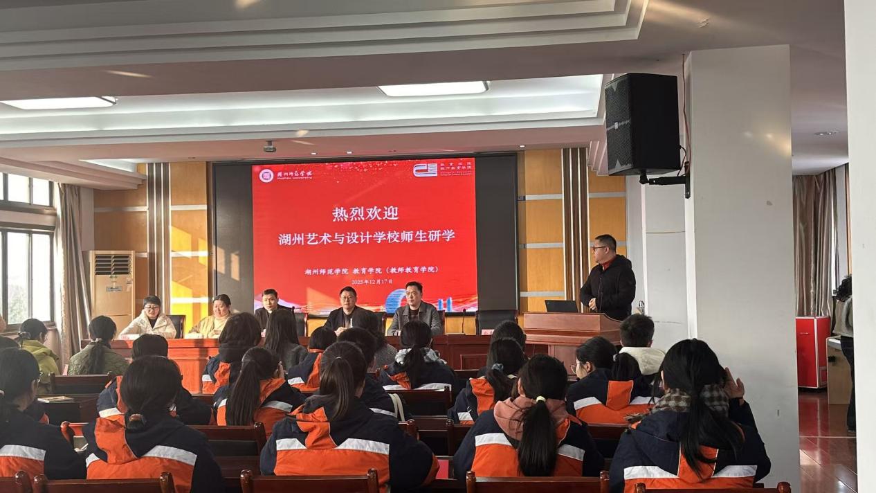 2025年12月17日,湖州艺术与设计学校师生一行47人,在湖州艺术与设计学校副校长费永军的带领下,来我院进行访问交流。我院书记沈江龙、副院长王贤德、学前教育系书记俞睿玮、学前教育系主任孙彩霞,以及优秀学生代表,出席了本次研学交流会。