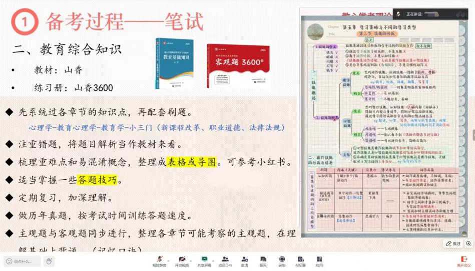 会议伊始,分享研究生首先围绕报考策略与考情研判展开介绍。他们建议备考同学需综合评估自身专业特长,密切关注目标地区的招聘政策与趋势,例如把握小学阶段对教师复合能力的要求,或在中学学科教学中找准发展定位。嘉宾们以亲身参与的宁波、嘉兴等多地招聘考核为例,系统比较了不同区域在笔试(涵盖学科专业知识、教育理论基础、教学设计、写作等)和面试(包括试讲、说课、结构化问答等形式)环节的侧重与差异,强调了基于目标考区特点进行精准复习准备的至关重要性。