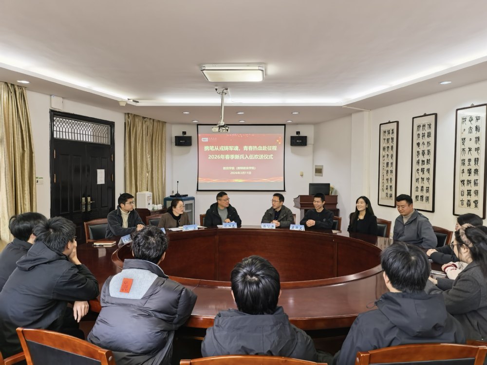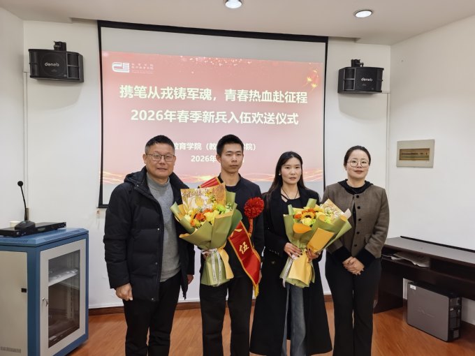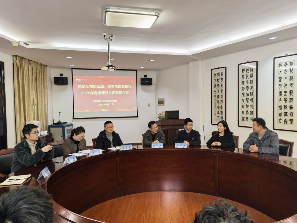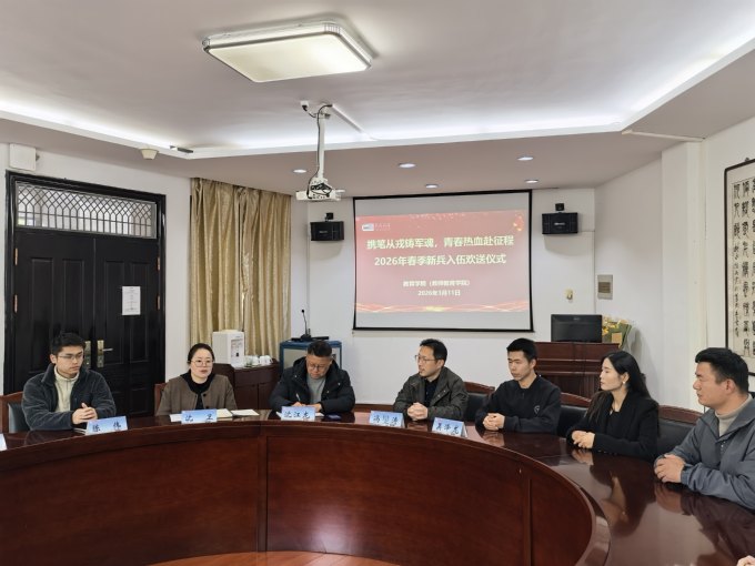 春潮涌动启新程,戎装逐梦赴山河。为热烈欢送学院2026年春季应征入伍新兵,传递学院全体师生的殷切期盼与美好祝福。3月11日上午,教育学院(教师教育学院)隆重举行“携笔从戎铸军魂,青春热血赴征程”新兵入伍欢送会。学院党委书记沈江龙出席,辅导员、班主任、学生代表、入伍新兵及家属到场参会,学院党委副书记兼纪委书记沈卫主持。