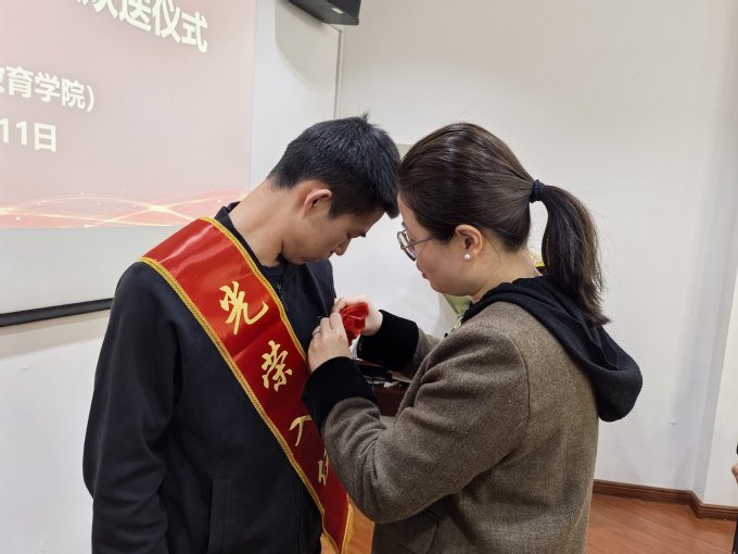 表彰激励环节简洁而庄重,学院领导为入伍学生亲手佩戴“光荣入伍”绶带和大红花,并送上鲜花,每一份荣誉都承载着学院的期盼与祝福,每一个身影都彰显着青年的责任与担当。最后,全体人员合影留念,定格下这一难忘的瞬间。