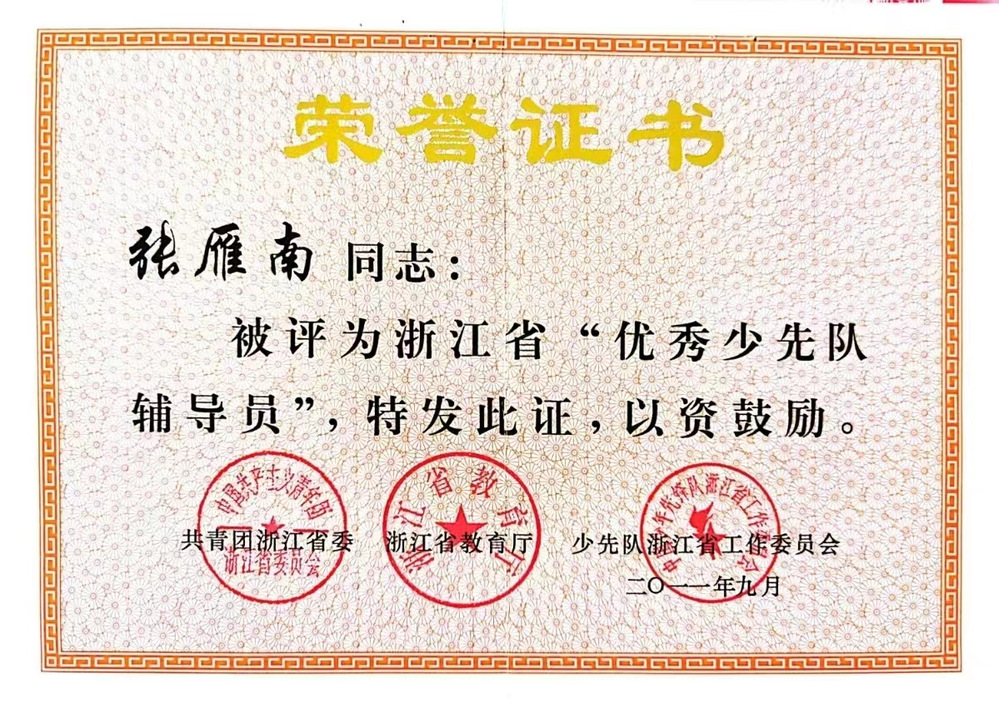 张雁南获“浙江省‘优秀少先队辅导员’”称号