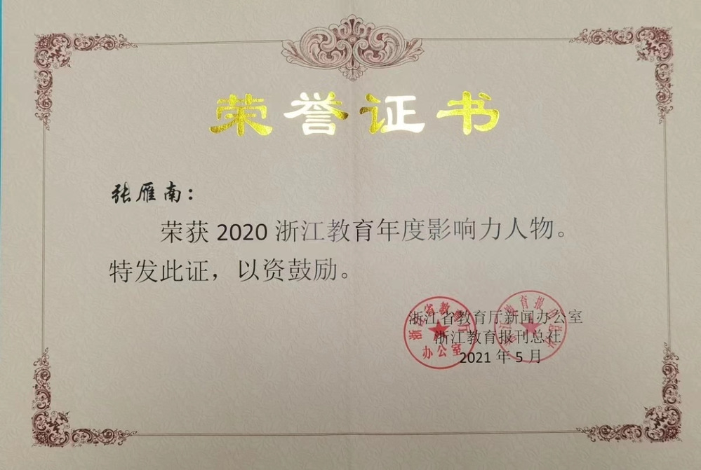 张雁南获“2020浙江教育年度影响力人物”称号