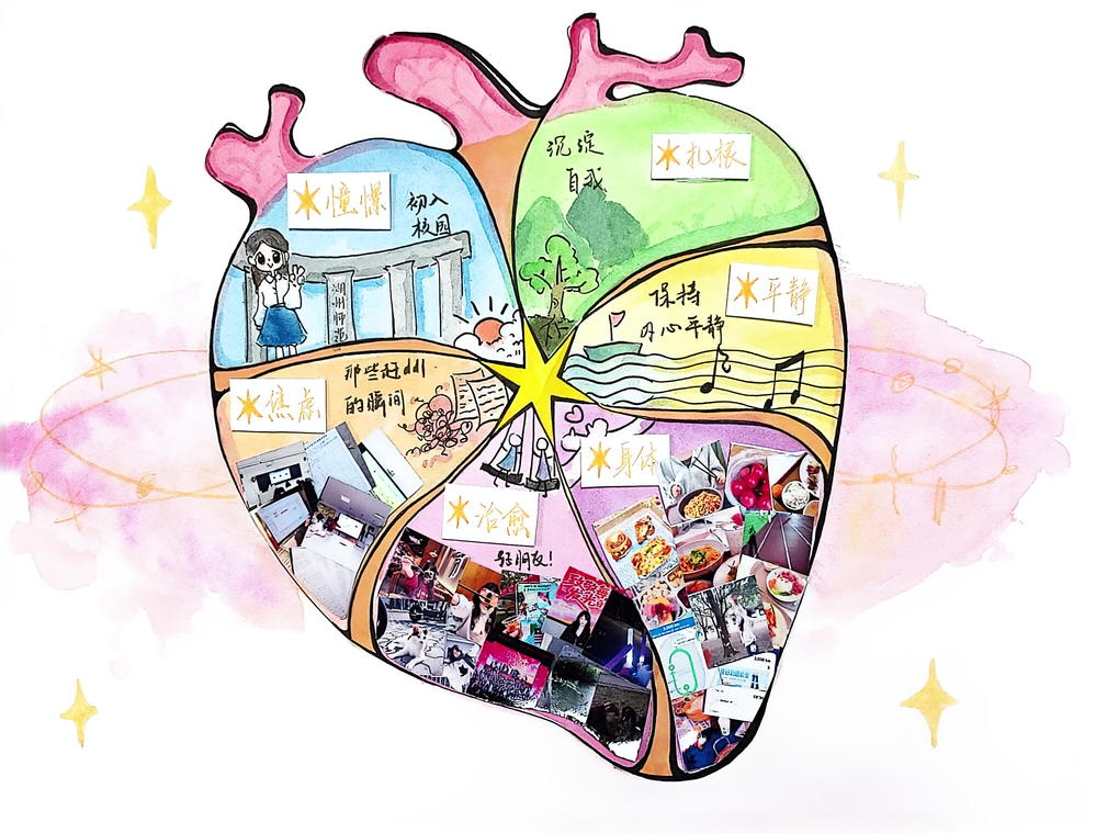 活动期间,同学们积极响应、精心创作,涌现出一批兼具创意与温度的优秀作品。《胶卷记心,逐光成长》以胶卷为载体,串联起生活中的温暖片段,记录专属自我的心灵成长之旅,传递出温柔而坚定的成长力量;《心芒引路,向新而行》以心脏轮廓为形,用六条小路从六芒星向外延伸,寓意情绪从心出发,在憧憬、焦虑与治愈中穿梭,向着学业、身心成长奔赴,诠释了“所有的路都从心底出发,也终将回归内心”的成长感悟。