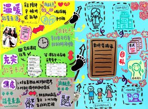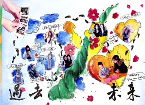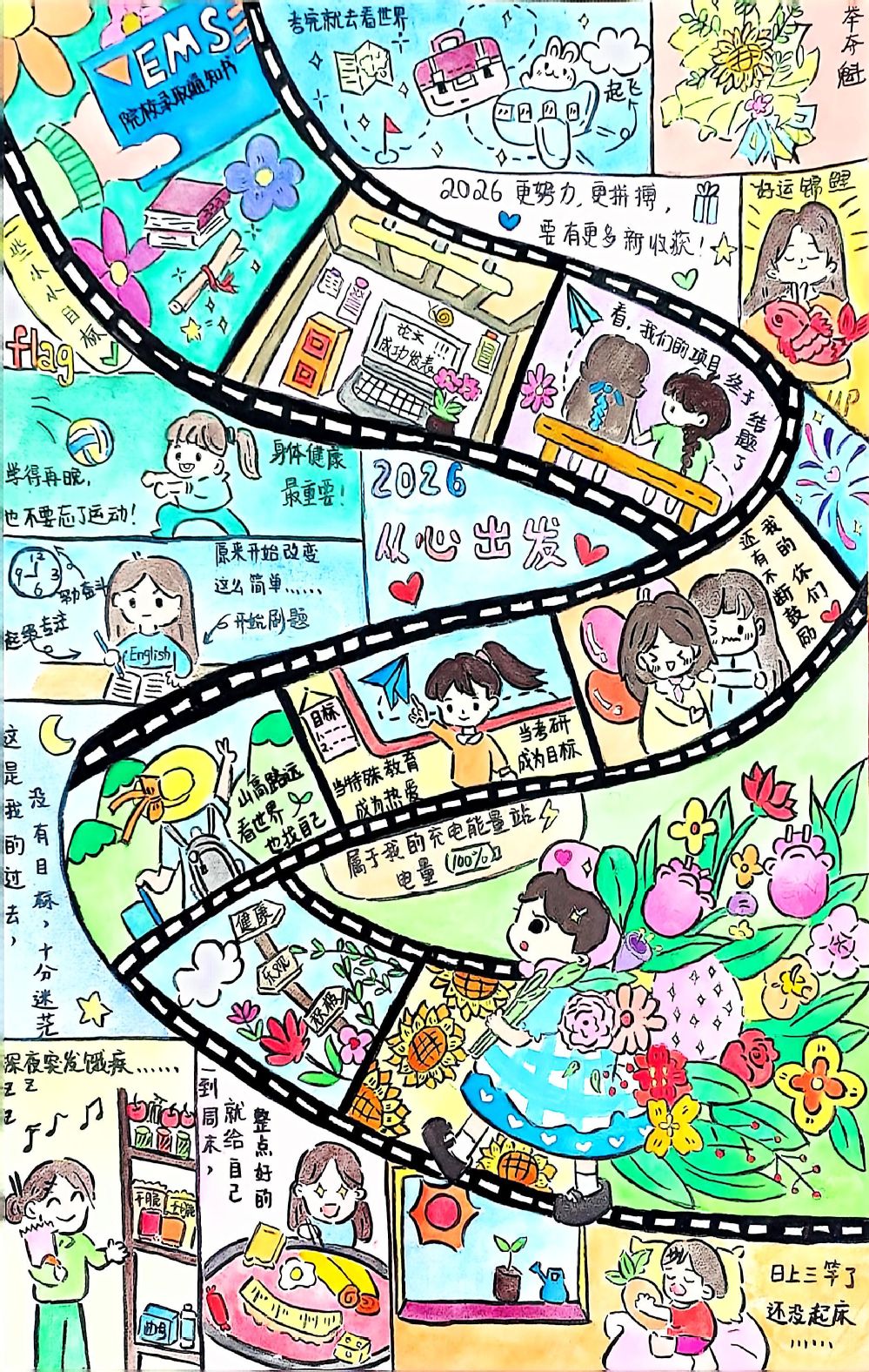 《心记过往,赴新序章》以“内心小账本”为灵感,创作者用碎片化拼贴手法,生动呈现过往的充实与焦虑、温暖与纠结,同时以清晰蓝图勾勒出新学期目标,中间的脚印与箭头意象,鲜活展现了从纠结过往到奔赴未来的成长蜕变。《蓝印藏往,绿韵生光》以色彩与意象为纽带编织成长轨迹,用蓝色拼图铺成过往印记,以绿色藤蔓与花瓣象征热爱与力量;《拾心向暖,逐光丰盈》通过“自在随心”“专注深耕”等情绪词,串联过往能量与未来目标,借彩虹阶梯的意象,诠释了带着反思奔赴丰盈自我的成长初心。