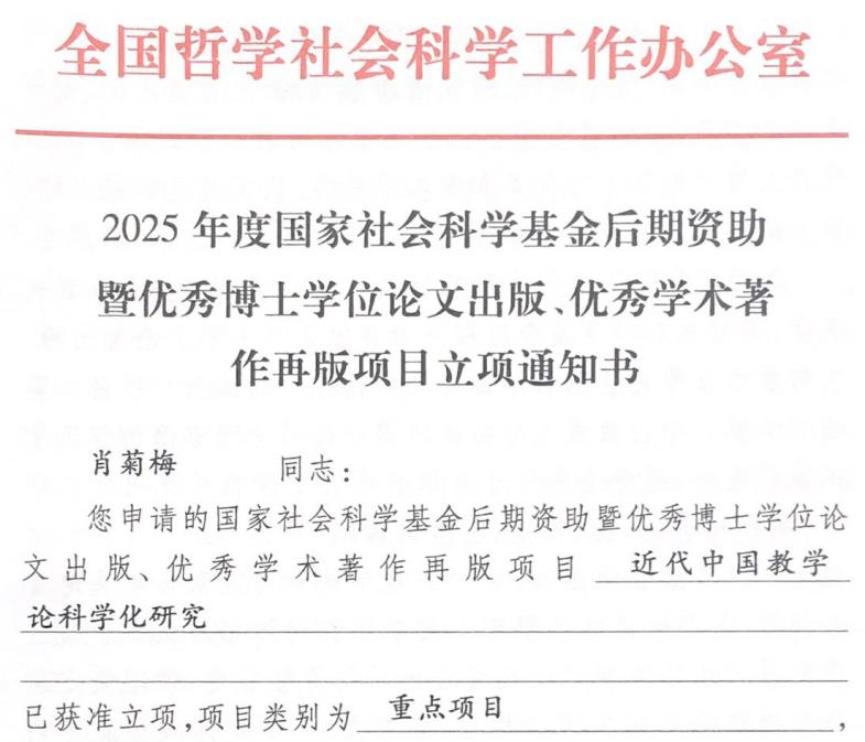 近日,我院收到全国哲学社会科学工作办公室颁发的国家社科基金后期资助项目立项通知书。肖菊梅教授申报的《近代中国教学论科学化研究》获批重点项目,这是我院首次在该类国家级项目中斩获重点课题。