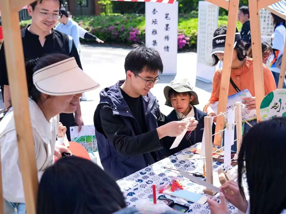 此外,学院还在胡瑗广场精心举办“杏坛雅集・笔墨传情”书法手作活动。现场设有优秀书法作品展、书签创作、书法摆台、手绘团扇四大体验区域。墨香氤氲,春意盎然,吸引众多师生与校友驻足参与。大家挥毫泼墨,题写校庆祝福、励志寄语与校训精神,在笔墨流转间重温校园时光,深切感受百年师范的深厚人文底蕴。