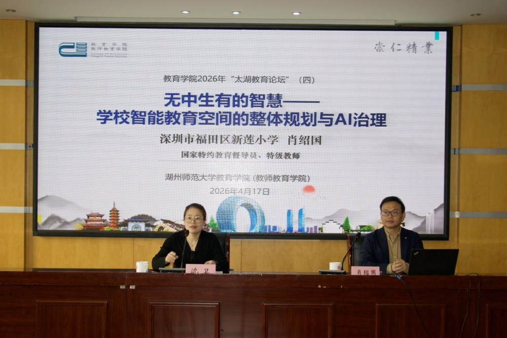 4月17日,我院举办太湖教育论坛暨“大先生”讲堂(十一)专题活动,助力师生进一步探索教育数字化转型背景下智能教育空间建设与职业发展路径。学院特邀国家特约教育督导员、教育部新时代“双名计划”名校长培养对象、深圳市福田区新莲小学书记兼校长肖绍国,作题为“无中生有的智慧——学校智能教育空间的整体规划与AI治理”的专题讲座。本次讲座由学院党委副书记沈卫书记主持,学院部分教师及研究生参加。